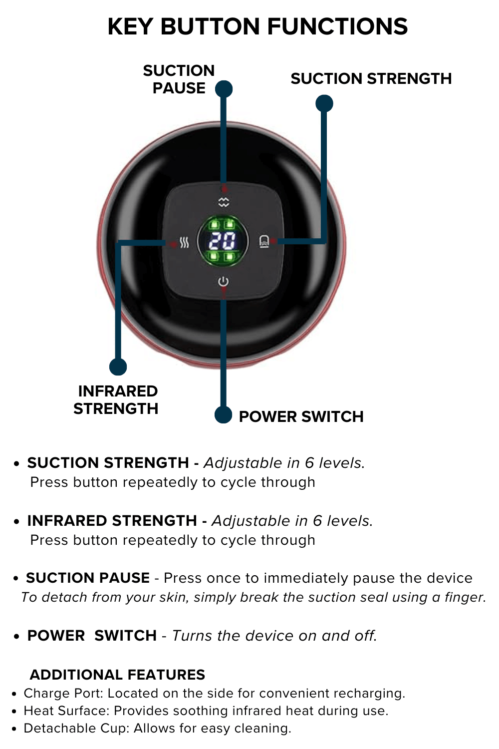 Your device is equipped with a pressure pause button, allowing you to quickly release the cupping pressure with just one click. The device will immediately enter standby mode when the button is pressed, making it easier to remove from your skin without discomfort.